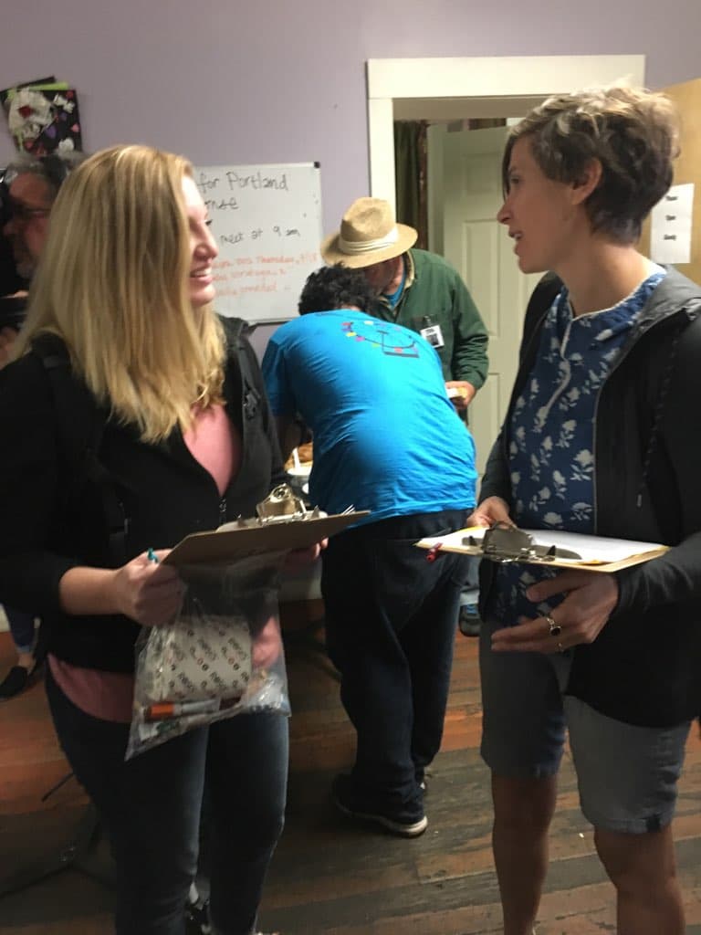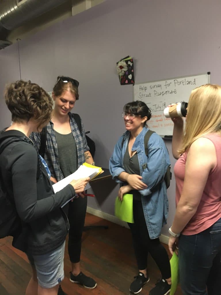 After a quick run-through of the strategy for conducting surveys by Street Roots Executive Director, Kaia Sand, and a break down of the survey by Neal Sand of the Yellow Brick Road‘s youth program, the crowd separated into groups of two to three people. The main requirement for the groups was for each to have an individual who had lived experience of houselessness.