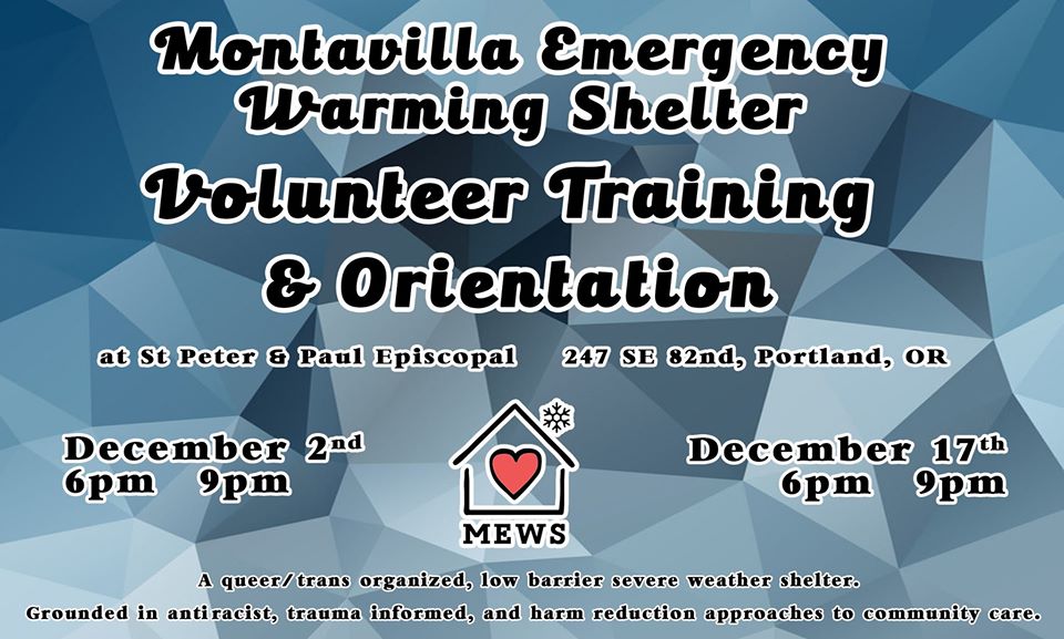 Montavilla’s Emergency Warming Shelter (MEWS) which operates out of St Peter & Paul Episcopal Church off of 82nd Avenue near Stark Street is one of the only shelters opening this year. The evening of December 17, 2019, was the second volunteer training held this year for the warming shelter.