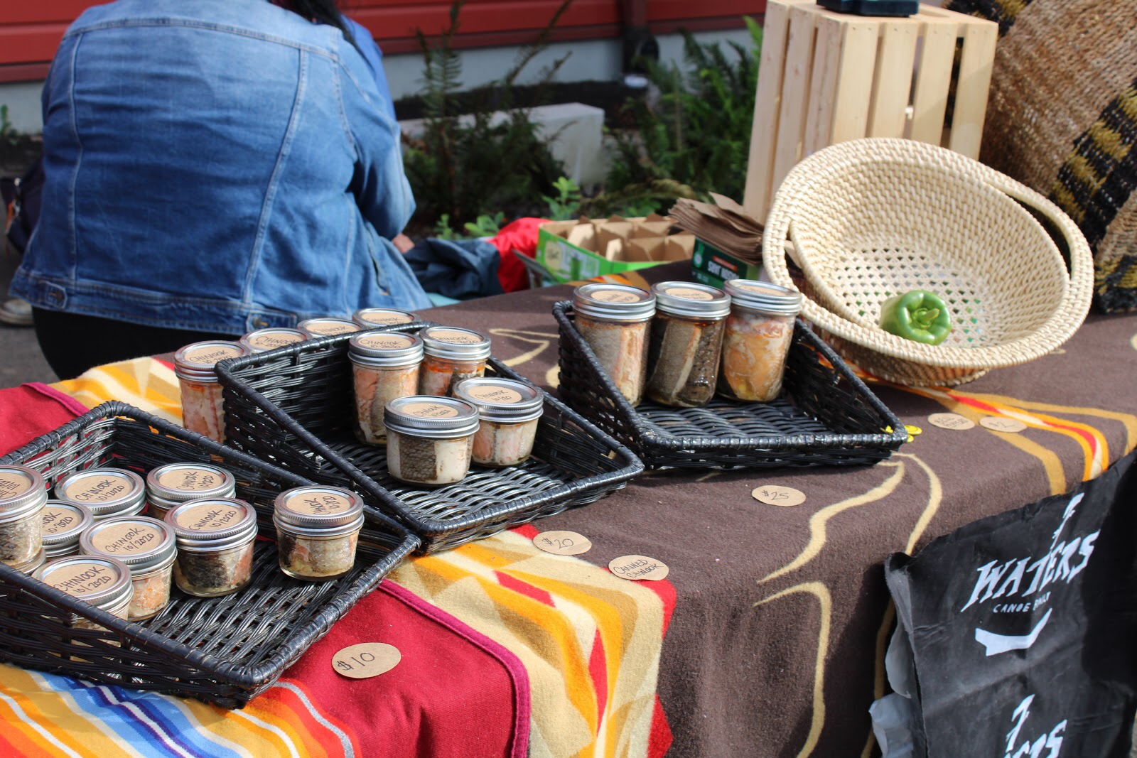 Lukas Anvus from 7 Waters Canoe Family, an intertribal canoe group, was selling canned Chinook salmon and fresh produce from their farm on Sauvie Island, raising money for a fundraiser for 7 Waters. They mainly sell at the Come Thru market, so you can find them at the next market in November.