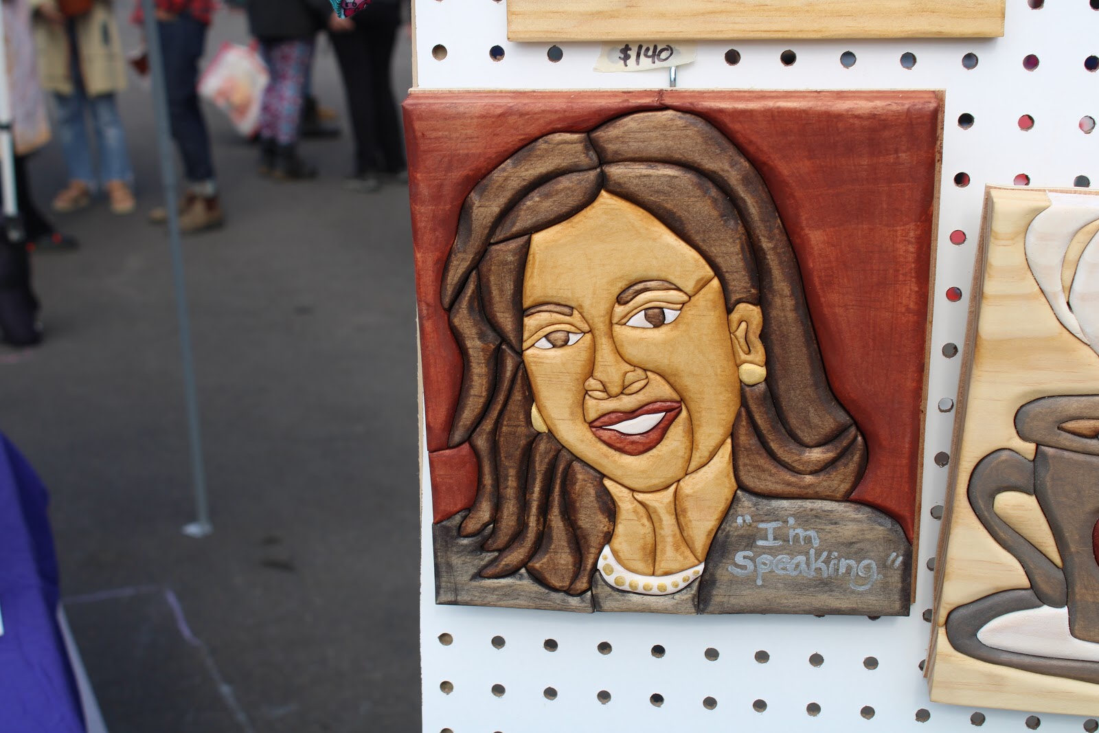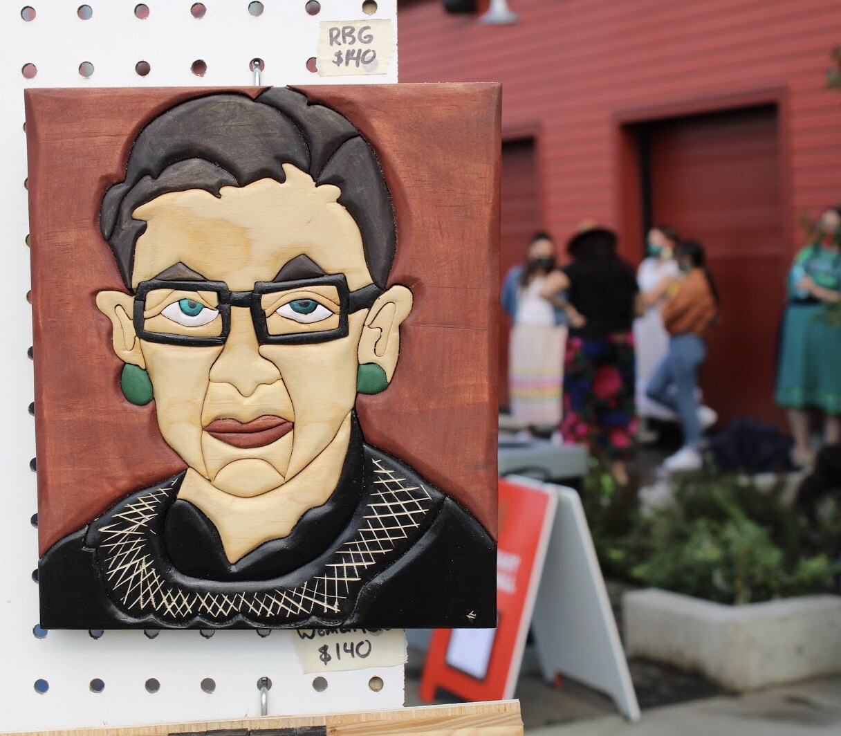 Atrum Arte had an array of handmade musical instruments and wood carvings on display at the market, including topical portraits of political figures Ruth Bader Ginsburg and Kamala Harris.