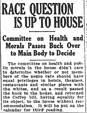 Portland’s Afro-American League conceived of the law to guarantee equal access to hotels, theaters and other public places regardless of race. Multnomah Representative John B. Coffey (1867 – 1926), a progressive Irish Catholic recently re-elected to the House, agreed to sponsor it. He introduced H. B. 344 on February 3, 1919.
