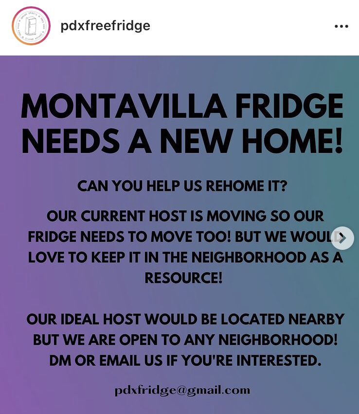 Have a home for the Montavilla free food fridge? More info here. They’re looking to move it soon.