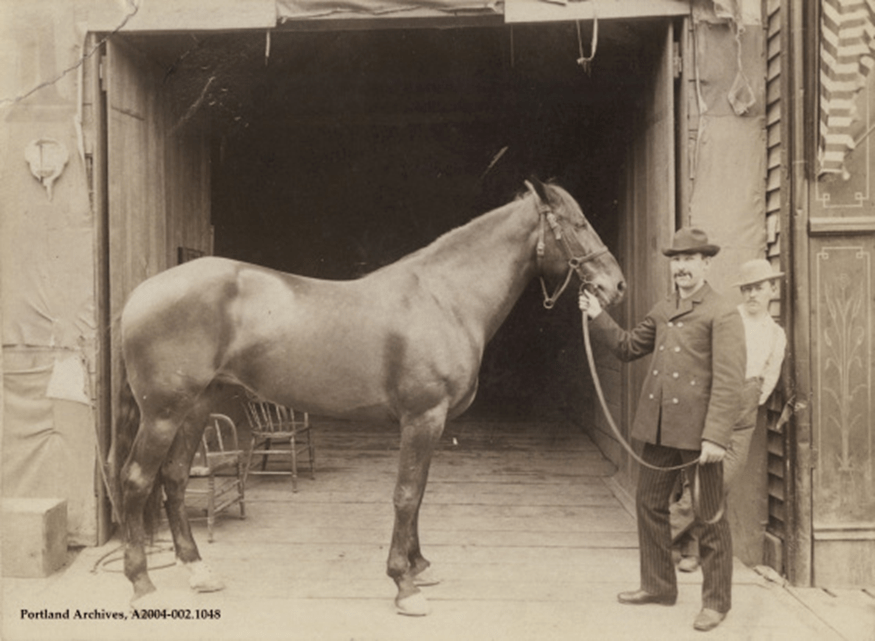 The first commercial stable was listed in Polk’s 1893 Portland City Directory under “Livery, Sale and Boarding Stables.” It belonged to John H. Rathbun (1833 – 1905).