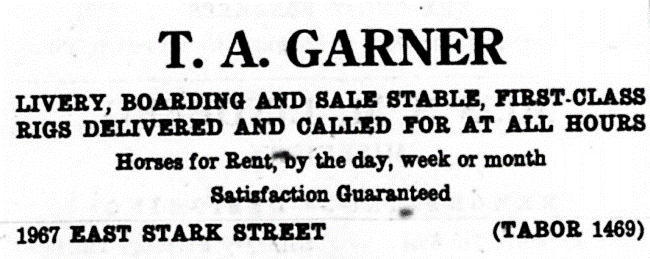 Still the stable near the corner of 80th and Stark endured longer than any other stable in Montavilla— more than 20 years. A few others appeared and quickly disappeared in the Portland city-directories: A. W. Johnson, 1903; G. K. Howitt, 1905 – 1907 (more on him later); C. C. Chappell, 1913. Thomas A. Garner held on a little longer. He took over the Chappell stable at 1967 E. Stark and operated it until 1918.